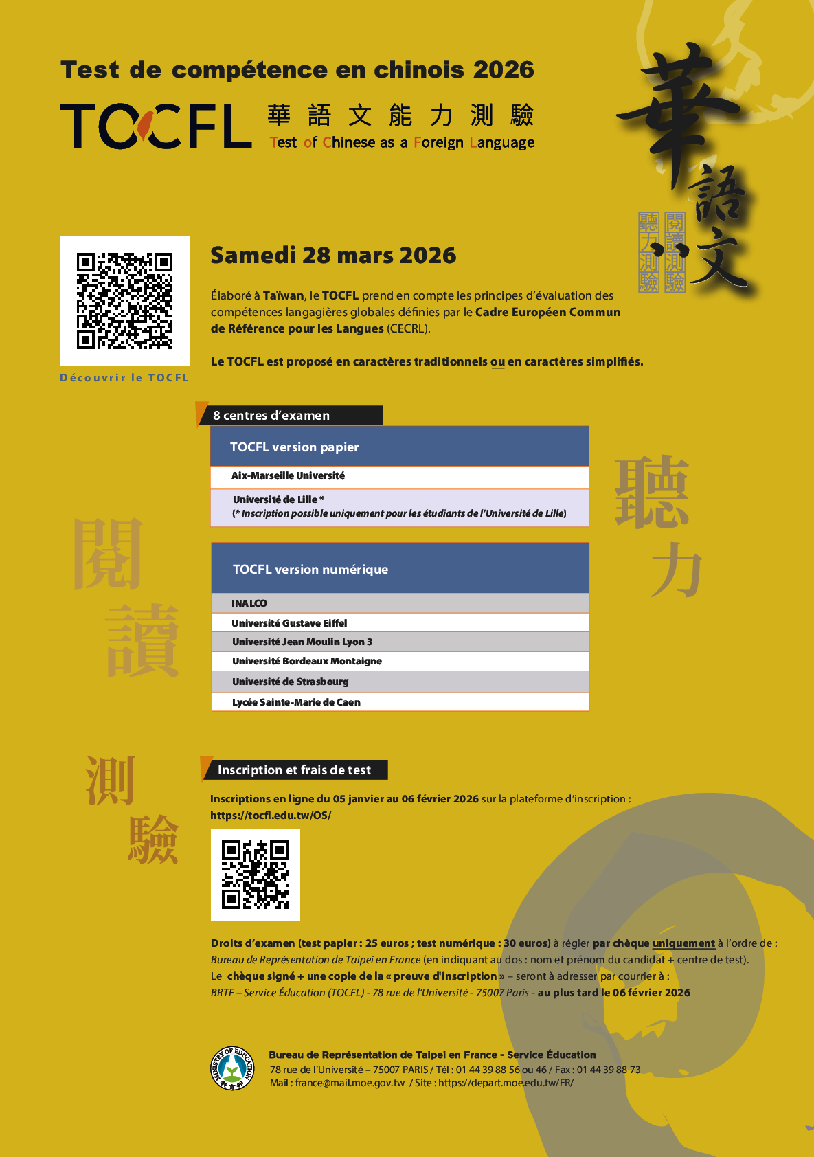 Les inscriptions sont à effectuer en ligne sur la plateforme d’inscription https://tocfl.edu.tw/OS/ entre le lundi 5 janvier 2026 et le vendredi 6 février 2026 et les frais d’inscription s’élèvent à 30€.